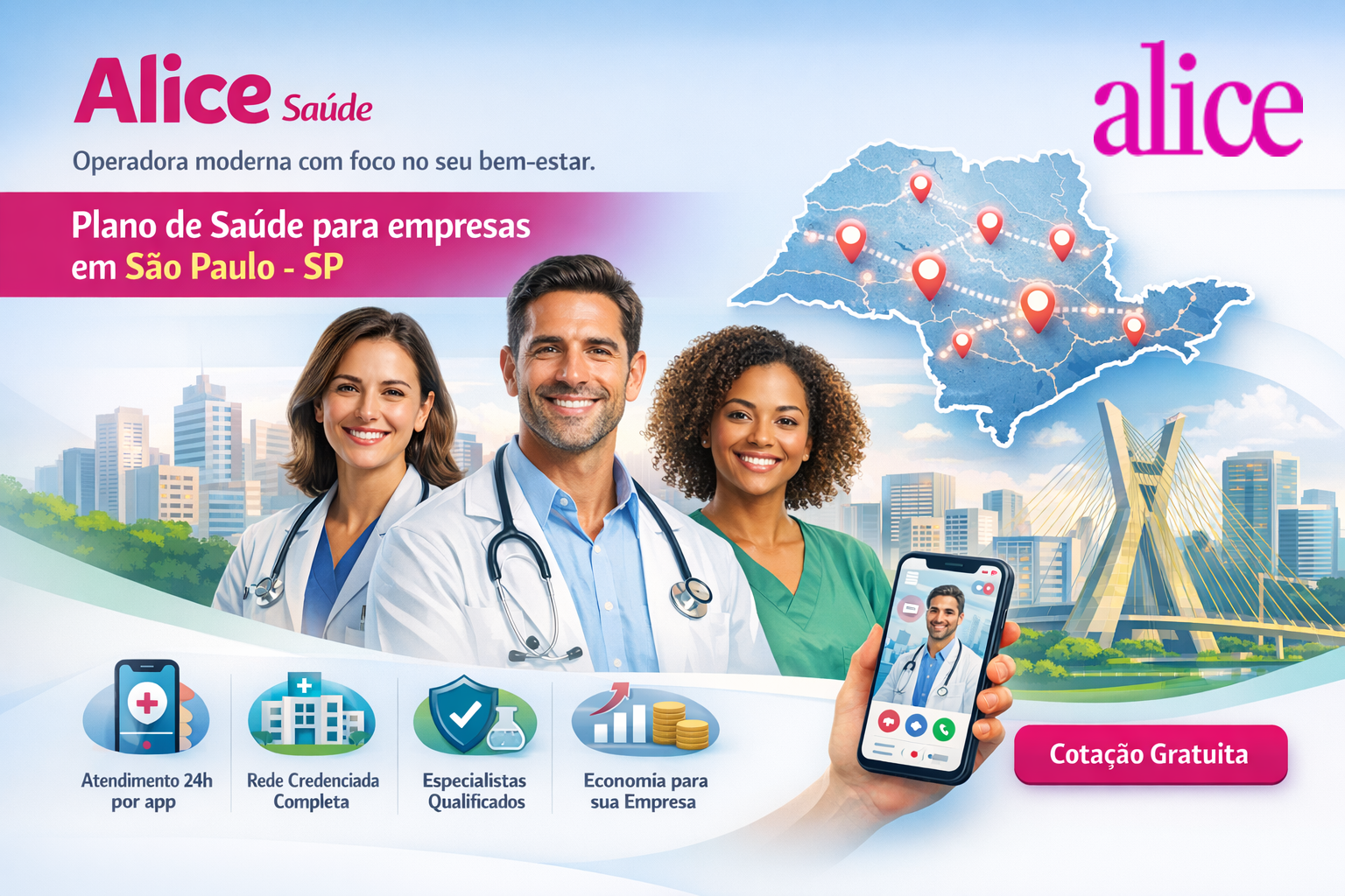 A Alice é uma operadora de saúde inovadora que oferece planos de saúde empresariais com cobertura nacional, combinando atendimento médico, tecnologia e acompanhamento contínuo da saúde dos beneficiários. Seus planos são voltados para empresas de todos os portes, incluindo MEIs, pequenas empresas e grandes organizações, com possibilidade de contratação a partir de 1 vida com CNPJ.