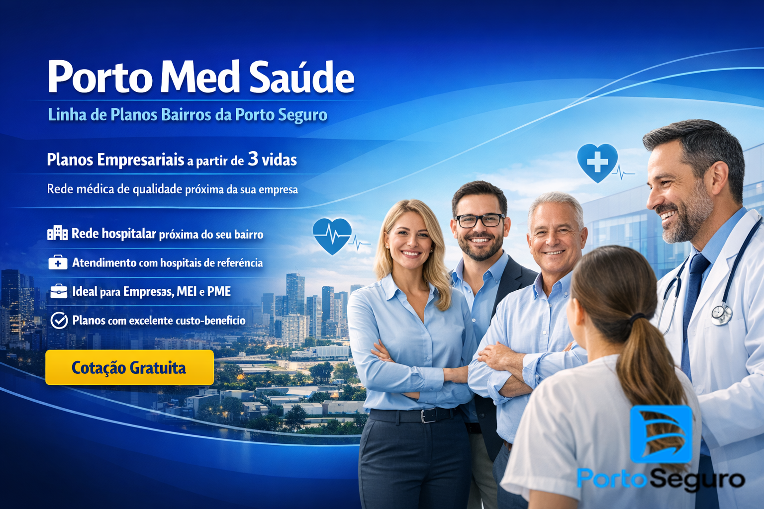 O PortoMed é a linha da Porto Seguro Saúde Bairros é um plano de saúde empresarial desenvolvido para pequenas e médias empresas, com contratação a partir de 3 vidas. A proposta oferece atendimento médico de qualidade com rede credenciada regional, próxima da empresa e dos colaboradores. O plano inclui consultas, exames, internações e telemedicina, proporcionando mais praticidade no dia a dia.