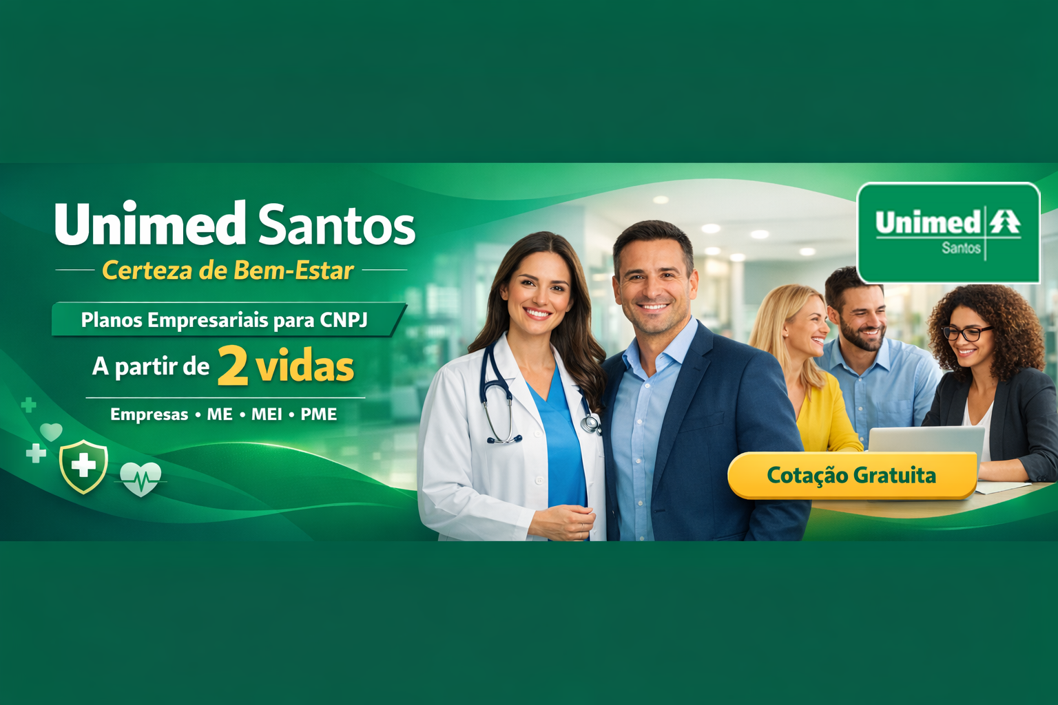 A Unimed Santos oferece planos de saúde empresariais e familiares com ampla rede credenciada, atendimento de qualidade e cobertura regional com suporte nacional para urgência e emergência pelo Sistema Unimed. Empresas podem contratar planos a partir de 2 vidas, com ou sem coparticipação, inclusive ME-Microempreendedor Individual